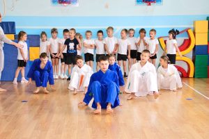 Спортсмены продемонстрировали дошкольникам элементы разминки, а также показали несколько простых приемов, которые произвели на них сильное впечатление. Затем сами дошколята смогли попробовать себя в роли дзюдоистов. Под чутким руководством своих старших товарищей и тренера они освоили правила этикета (например, поклон уважения) и базовые элементы безопасного падения – укеми.
